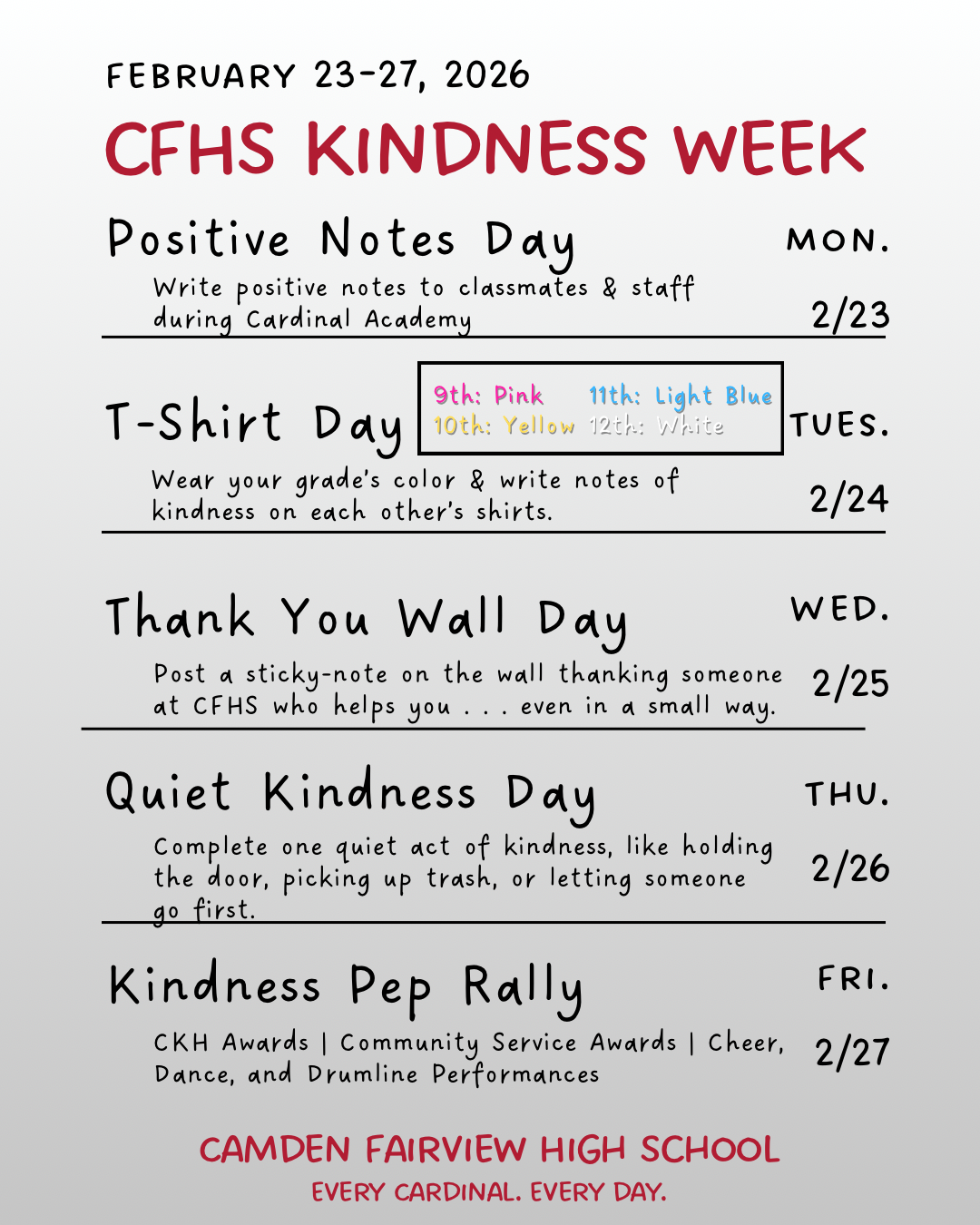❤️🤍 CFHS CKH Kindness Week 2026: February 23–27 🤍❤️This week, Camden Fairview High School will celebrate CKH Kindness Week, a campus-wide initiative designed to promote positivity, connection, and ...